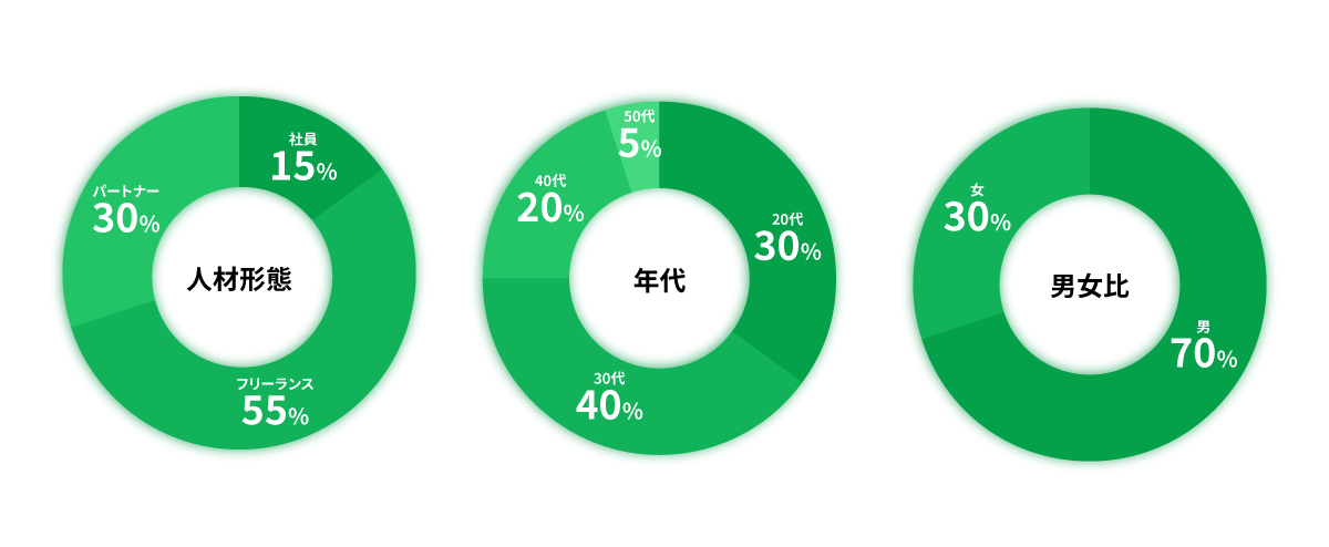私たちはマージン率に天井を設け、正当に高い報酬を支払うことが最大の満足度と考えます。その為に、営業、採用、バックオフィス業務を効率・低コスト化し、エンジニア・クリエイターの搾取を軽減します。